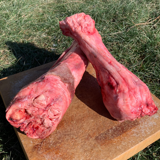 Beef Bones-2 pack are 'to the rescue' to satisfy your avid chewer! These are GINORMOUS Beef Marrow Bones with a bit of scrappy stuff still attached. They are complete with their natural marrow goodness. Each one is 8-12 inches long & super heavy. They can be a great fit for big dogs that love to chew. These super-hard bones are raw & fresh frozen for your pets' enjoyment!