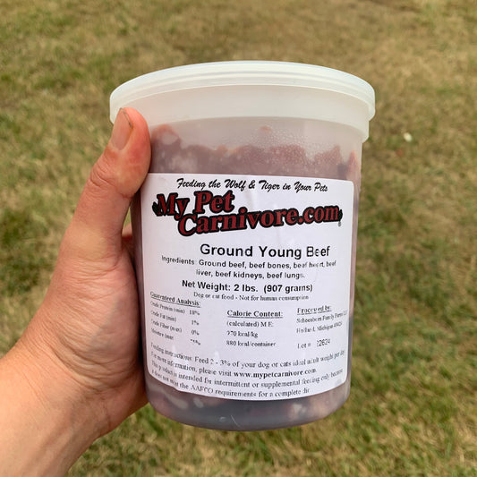 You'll receive a 2 LB. deli container of Ground Whole Young Beef. This product includes the meat, bone & organs altogether. We coarse grind & then fresh freeze the product. These Michigan cows have been milk fed & are 1 to 7 days old, healthy males from dairy cattle stock. This very young meat source makes for softer, more digestible bones. Also, it's an extremely lean selection (about 1% fat!).