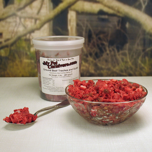 Our "Tripe with T & G" contains 80% green beef tripe & 20% beef trachea & gullet in a 2 LB. deli container. It is coarse ground from Michigan-raised dairy cattle. It is all natural with no preservatives or additives. Unlike other brands, our tripe contains no denaturing agents.