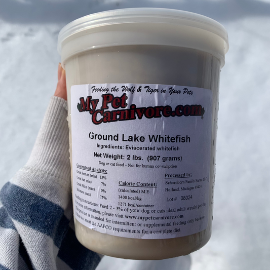 Ground Lake Whitefish-2 LB. More specifically, it is coarse ground, Lake Michigan Whitefish & it's packaged in a convenient 2 LB. deli container. We use the whole specimen including the head but excluding the guts. What a lovely near-whole prey offering! These are not scraps or throwaways!