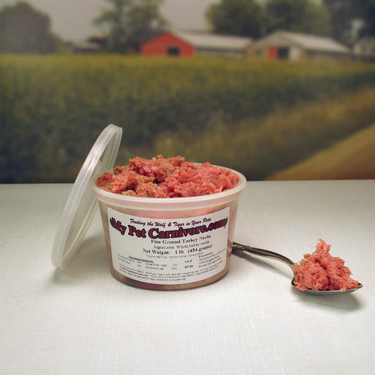 Our Fine Ground Whole Turkey comes in 1 LB. deli container. This grind is from the whole prey, which means it contains all the meat, bones & organs, even the feet. The only things removed from our turkeys are the feathers & intestines. These birds were raised by a small Michigan farmer who only produces one flock every year. It's part of our exclusive line of products, perfect for your cat or puppy!