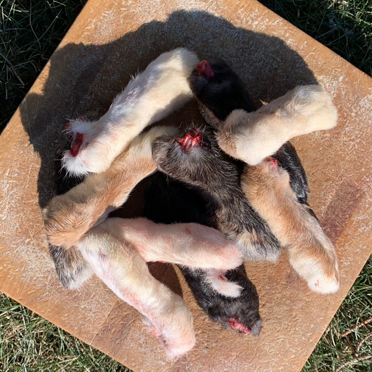 Rabbit Back Feet! This popular treat is ten, fresh frozen whole feet in a resealable plastic bag. With fur n' all. These are larger than our rabbit front feet. All of our rabbits are Midwestern raised. They are sourced both from small farms & from rabbit fanciers.