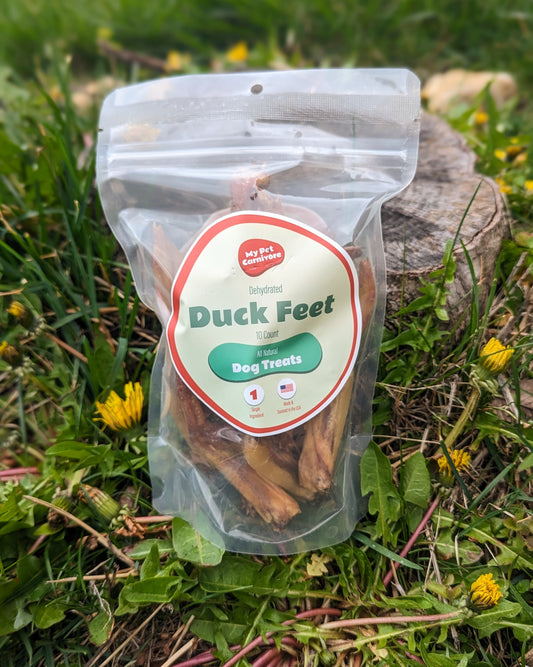 Yum! Ten Dehydrated Duck Feet. These chews are completely unadulterated & natural. They are here for your pets' crunchy, tasty pleasure! 10 of these treats come packaged in a recloseable plastic bag. Dogs love these easy-to-consume snacks!