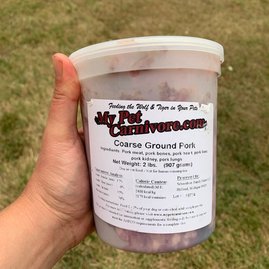 Coarse Ground Whole Pork contains meat, organ & bone & is packaged in a convenient 2 LB. deli container. This lovely selection is coarse ground from Michigan-raised pigs. Our pork is fresh frozen for your pet's optimal health!