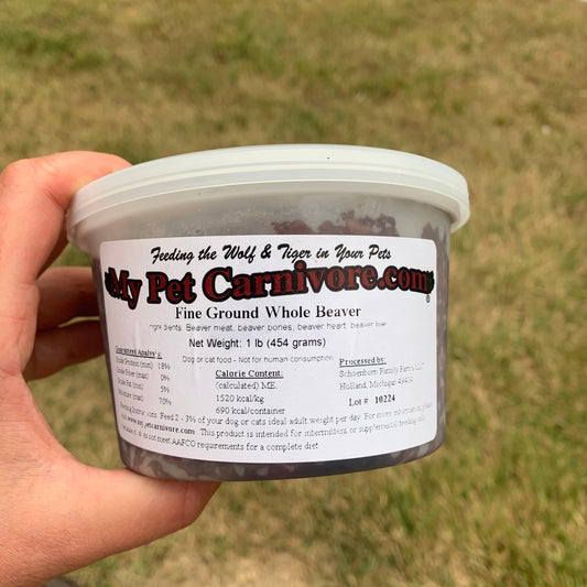 Our same great Beaver product is now available in a fine grind! Delicious wild-trapped Fine Ground Beaver in a convenient 1-LB. deli container. This includes the whole animal: meat, bones & organs. This very natural product has been skinned & eviscerated then fine ground & fresh frozen.