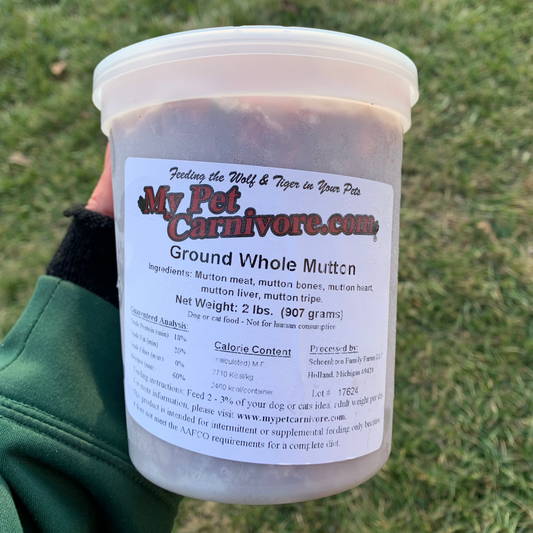 Our mutton contains the whole animal. It is a lamb (a sheep) that is over 1 year old. It's the same wholesome animal as its younger relative. We use the whole animal - not throw-aways or left-overs. The result is optimal nutrition using meat, bones, & organs. Includes the tripe! It is coarse ground & packaged in a convenient 2 LB. deli container & fresh frozen for your pets' optimal nutrition.