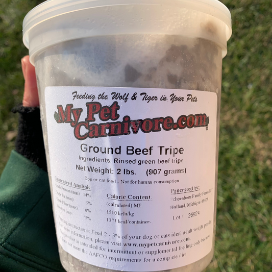 Behold, 100% Ground Green Beef Tripe in a 2 LB. deli container! We offer the finest quality tripe, if we do say so ourselves! It is coarse ground from Michigan-raised, grass-fed dairy cattle. It is all natural with no preservatives or additives. Unlike other brands, our tripe contains no denaturing agents.