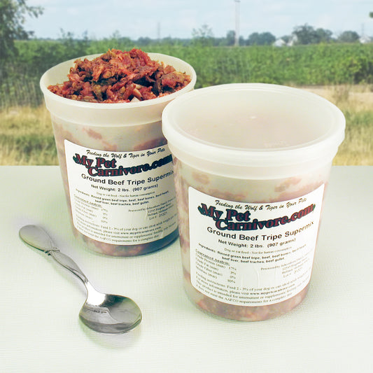 Tripe Supermix is our signature product! Tripe Supermix is coarse ground & packaged in a 2 LB. deli container. It contains 50% green beef tripe, 40% beef muscle meat/bone/organ, 10% beef trachea & gullet. This product is light on bone & organs. If you choose to feed this item regularly please balance it out with additional organs & bone.
