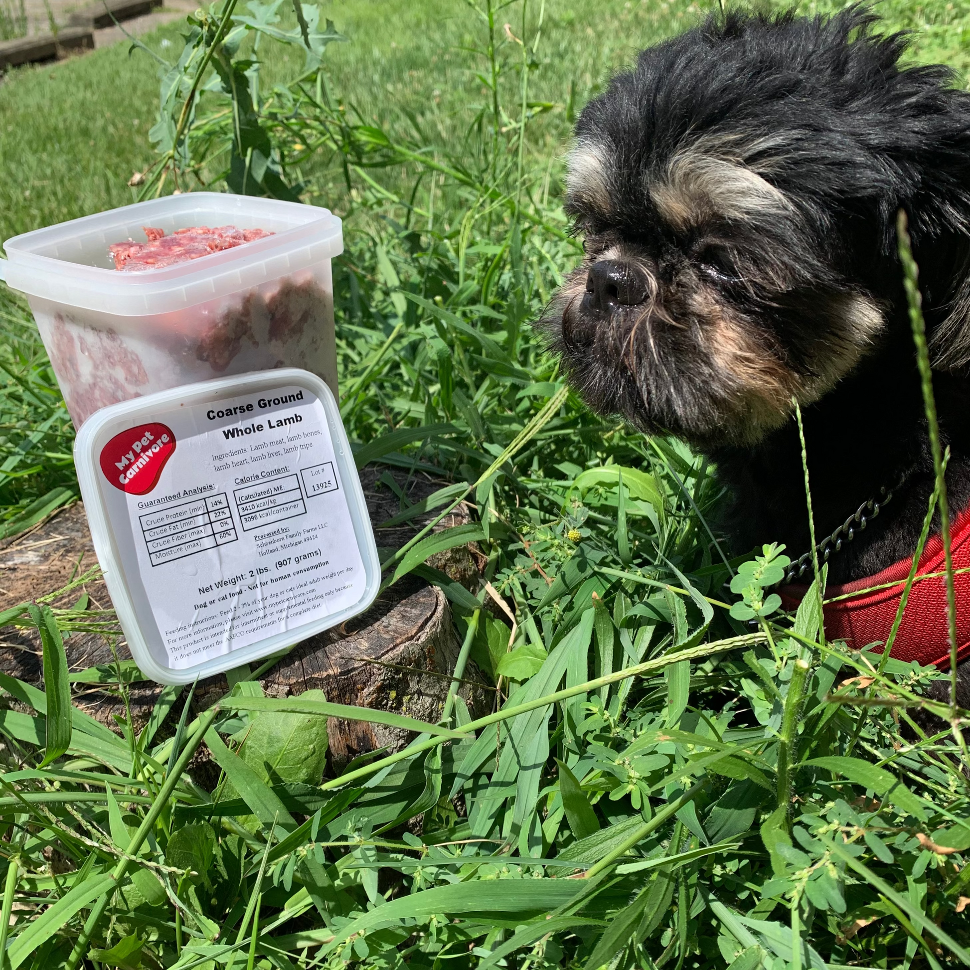 Our Coarse Ground Whole Lamb contains the whole animal. Lambs are sheep that are less than 1 year old. It's the same wholesome animal as its older relative. This is a lovely, hearty, thick product. It's packed with flavor, perfect for your high-energy pets, those with discriminating tastes or pets who are a little underweight. We use the whole animal - not throw-aways or leftovers. The result is optimal nutrition using meat, bones & organs. Includes the tripe! It is coarse ground & packaged in a convenient 2 LB. deli container & fresh frozen for your pets' optimal nutrition.
