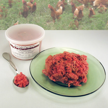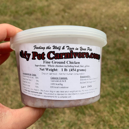 Our Fine Ground Whole Chicken-1 LB. is triple ground chicken meat, bones & organs. Fresh frozen from healthy Michigan-raised birds. This popular product is packaged in a convenient 1 LB. deli container. This grind is from the whole prey. It also contains the head & feet for extra nutrients. No feathers. Our chicken products can vary quite a bit based on the breeds of chicken used, you can read about some of the differences here: variable chicken.