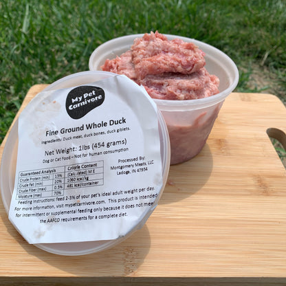 Enjoy this exceptional, quality duck that's packaged in a convenient-to-use 1 LB. deli container. It is a triple ground whole prey bird that includes the meat, bones & organs with the head & feet. You get the whole healthy Michigan-raised duck minus the feathers & intestines. It has been fresh frozen to retain all the nutrients for your pets!