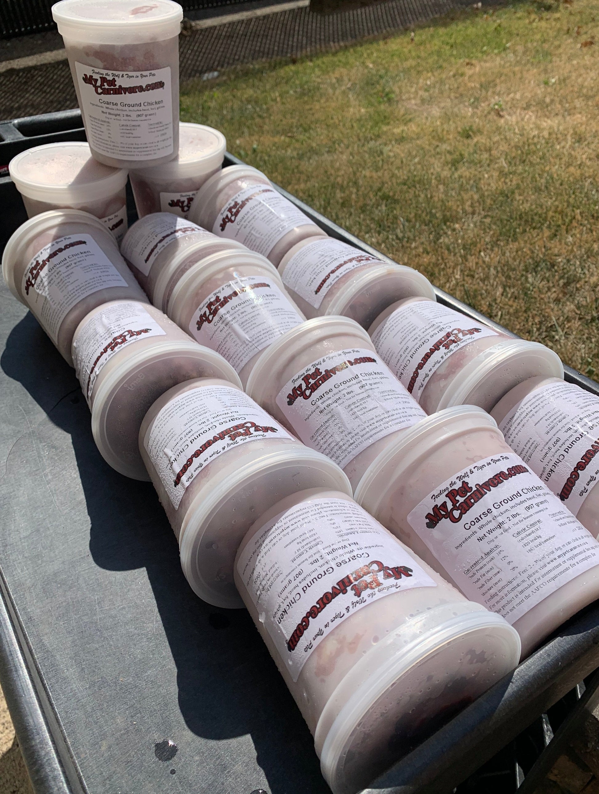 Your pets will enjoy this coarse ground, whole Michigan chicken including meat, bones & organs in a convenient-to-use deli container. This grind is whole prey & also contains the head & feet but no feathers. Each chicken was lovingly selected, artisanally butchered & fresh frozen for optimal nutrient retention. Indeed, it is one of our most popular selections. Our chicken is a little different in the summer months.